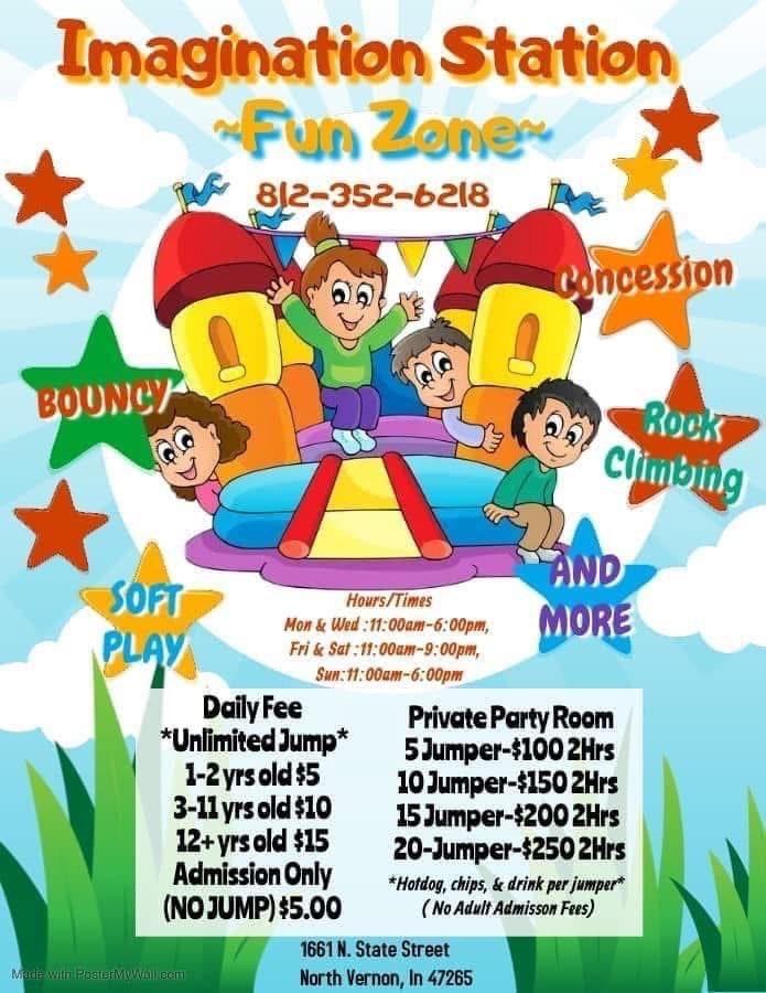 Imagination Station Fun Zone is North Vernon’s go-to indoor playground and party spot. We offer a dedicated toddler area, bouncy park, and interactive games for all ages. Our mission is to provide a safe, exciting space for families to play, celebrate, and make memories. Whether you're planning a birthday party, hosting a private event, or just stopping by for open play, we’re here to deliver fun for everyone in North Vernon and beyond.